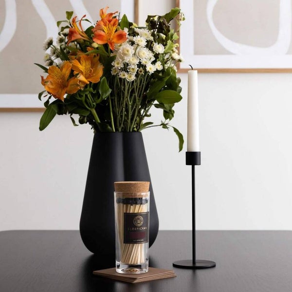 ELDSTICKAN Large Black is 15 cm hoog, bevat ongeveer 100 lange lucifers en heeft het aansteekoppervlak op het etiket. Deze elegante pot, met zijn kurken stop, is een mooi en tijdloos stuk interieur dat in elk huis past.